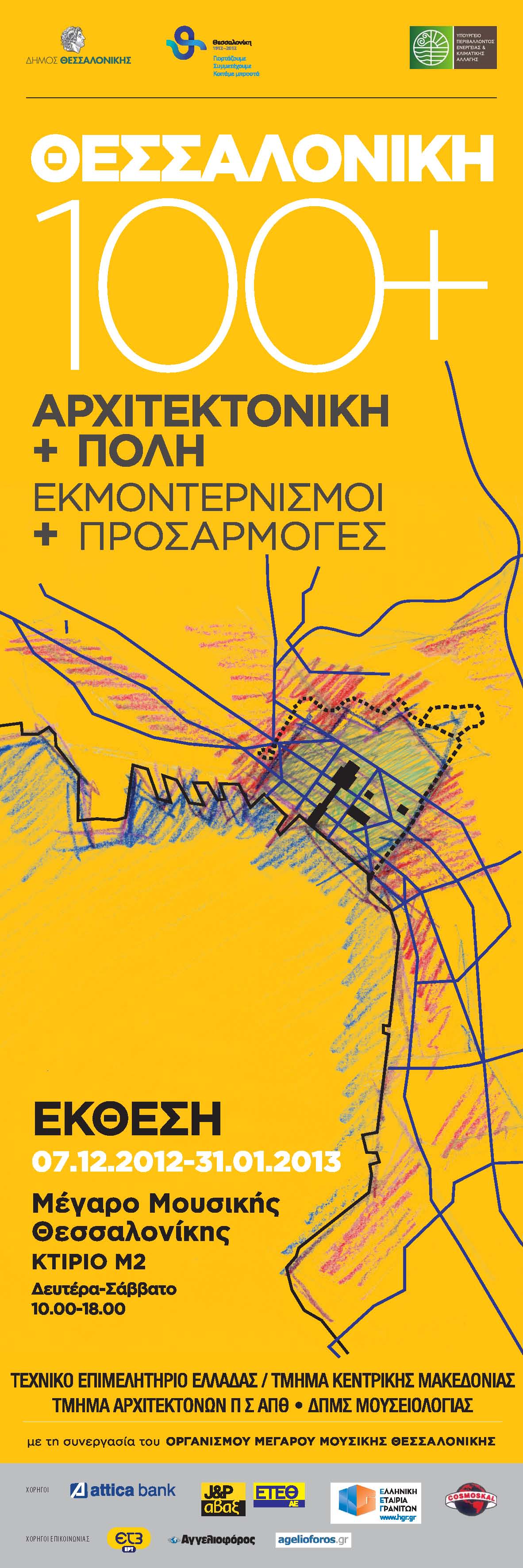 Η έκθεση με τίτλο «ΘΕΣΣΑΛΟΝΙΚΗ 100+. Πόλη και Αρχιτεκτονική. Εκμοντερνισμοί και προσαρμογές», διοργανώνεται από το Τεχνικό Επιμελητήριο Ελλάδας /Τμήμα Κεντρικής Μακεδονίας, το Τμήμα Αρχιτεκτόνων της Πολυτεχνικής Σχολής του ΑΠΘ και το Διαπανεπιστημιακό Πρόγραμμα Μεταπτυχιακών Σπουδών Μουσειολογίας, με τη συνεργασία του Οργανισμού Μεγάρου Μουσικής Θεσσαλονίκης και με την στήριξη του Υπουργείου Περιβάλλοντος, Ενέργειας και Κλιματικής Αλλαγής. Εντάσσεται στο πρόγραμμα «Θεσσαλονίκη 1912-2012» του Δήμου Θεσσαλονίκης, για τον εορτασμό των 100 χρόνων από την απελευθέρωση της πόλης, ενώ τη γενική επιμέλεια της έκθεσης έχει ο καθηγητής του Τμήματος Αρχιτεκτόνων ΠΣ ΑΠΘ Νίκος Καλογήρου.